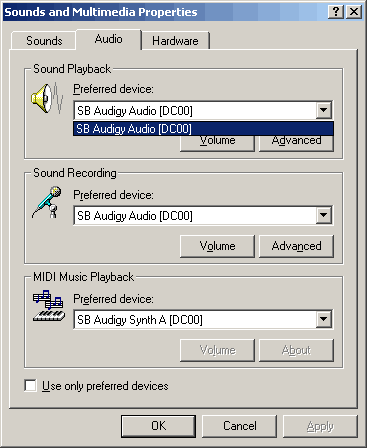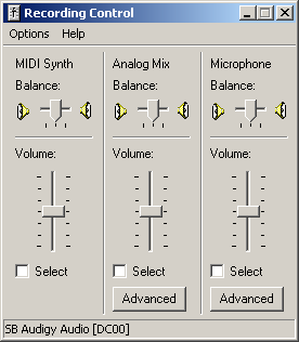 Keep in mind that some sound cards have the ability to record from more than one channel at a time. The Sound Blaster Audigy card that is used in this example doesn't. If your sound card allows more than one channel, you may have to select it in the "Preferred device" listing in the "Sound Recording" area of the above window. If that is the case, the following may not apply (except for setting the volume).