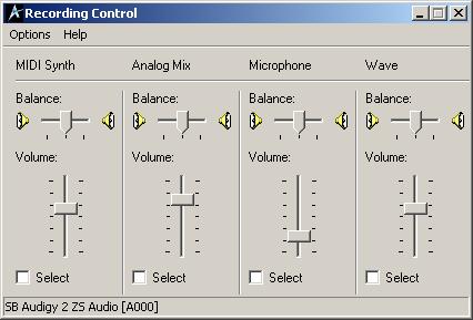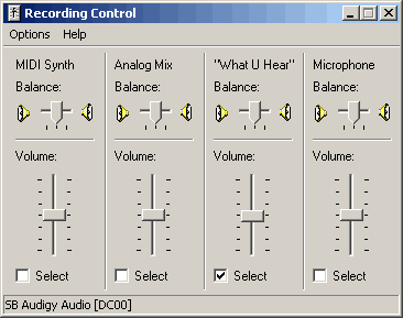 Select the "Volume..." button in the "Sound Recording" area of the previous window and something similar to the following window should appear. This window allows you to select the preferred channel by checking the "select" box of the channel you want. Here you can also set the volume that the channel records with. Too high a volume can cause distortion, too low will cause the recorded sound to be too quite. Usually right in the middle is the best option. The desired channel ("What U Hear" for this sound card) isn't shown. It must be made visible.