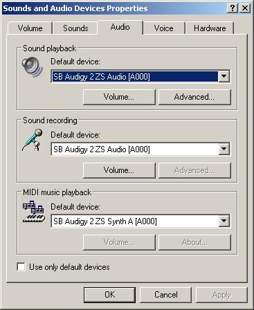 Something similar to the following window should appear. In this window, you can select the preferred device Gun Cam will use for playback and recording. The device for playback is probably already set to the one you want. In this picture, there is only one option to select for playback and recording, the Audigy Audio soundcard. The device for recording probably needs some more configuring. Usually there is more than one "channel" that can be used for recording, such as the microphone or "line-in". Normally the preferred recording channel is the microphone. That isn't what you want though. The channel you want is one that represents what is being sent to the speakers. This channel goes by different names depending on the sound card. Sound Blaster uses the name "What U Hear", others use "Stereo Mixer". You may have to experiment to find the right one for your system.